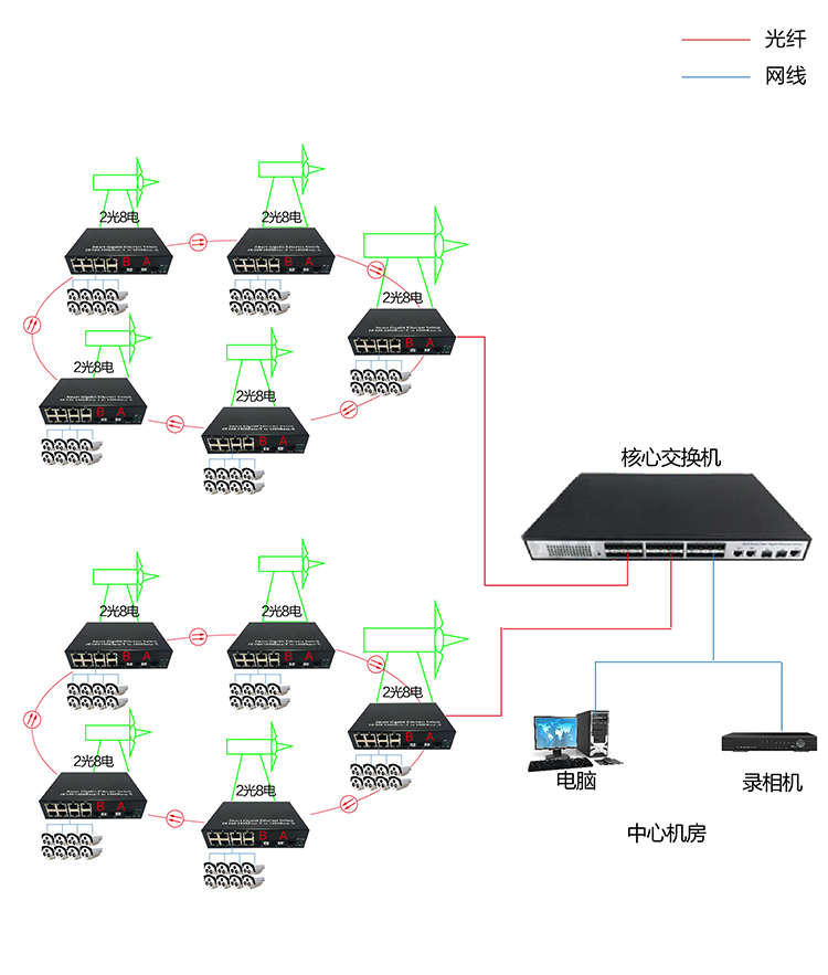 千兆环网两光八电有8个 RJ45(10/100/1000M自适应)网络接口和 2个 1000M光接口,分别用来连接双绞网线和光纤。网口支持直通线 /交叉线自适应,可以是全双工,也可以是半双工模式。光纤接口可以按用户需求配置,具有高可靠的稳定性。